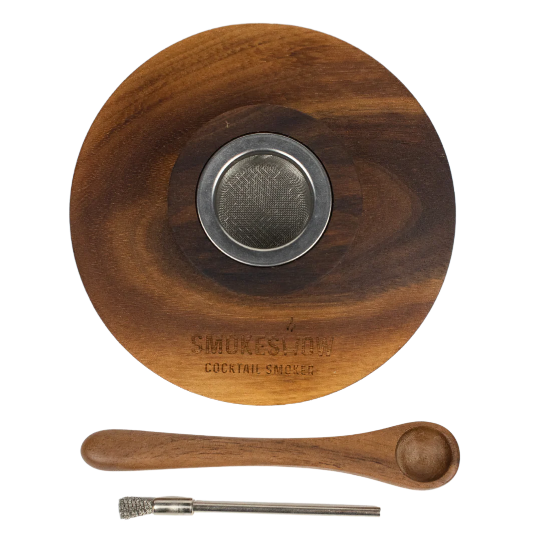 Smokeshow Cocktail Smoker with Topper Lid: Comes equipped with a wooden measuring spoon and a wire brush for easy maintenance, ensuring a flawless smoking process.